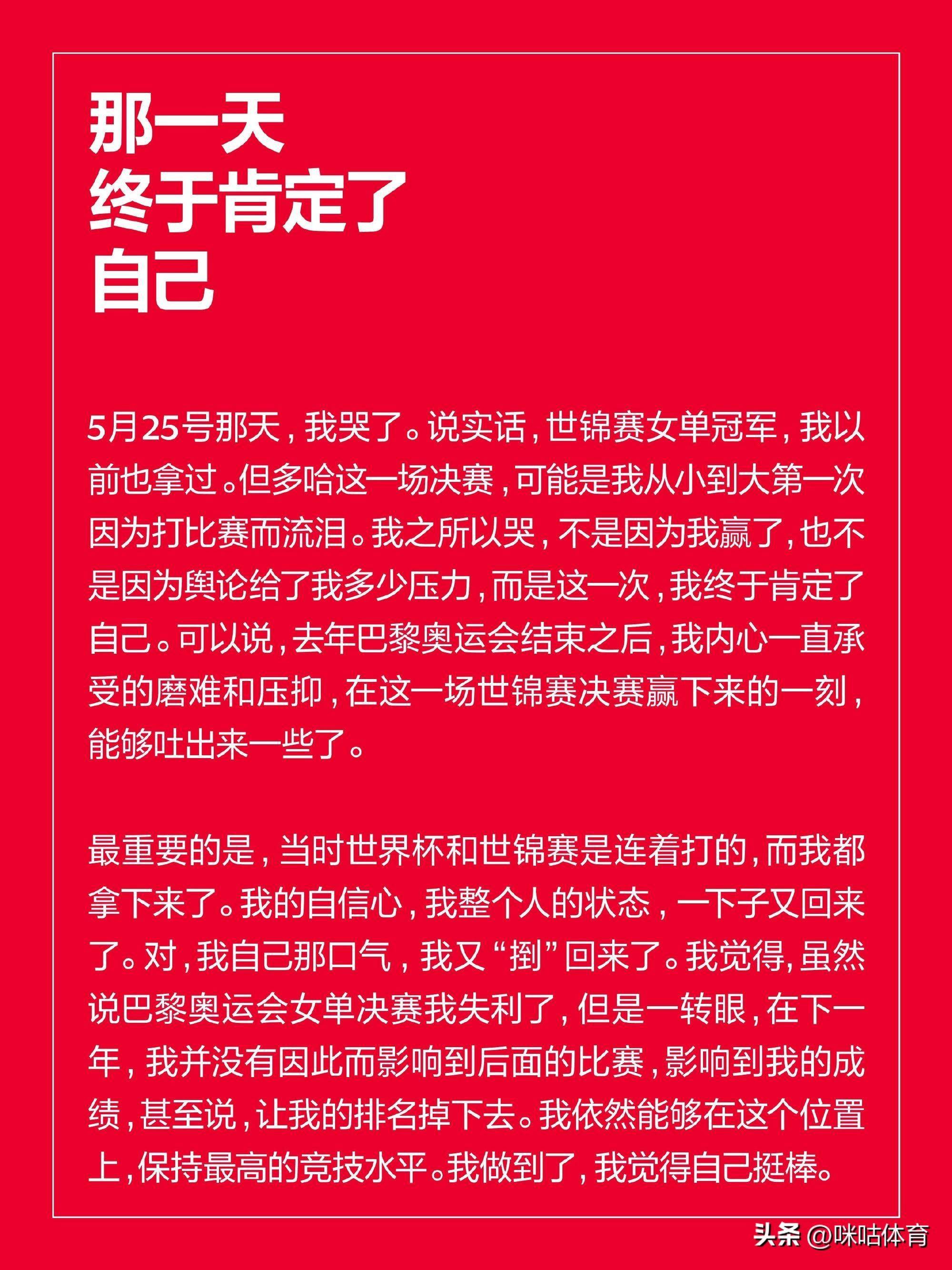 “5月25日多哈世锦赛那一天,我哭了~不是因为赢了,也不是经历了多少压力,而是我终于肯定了自己